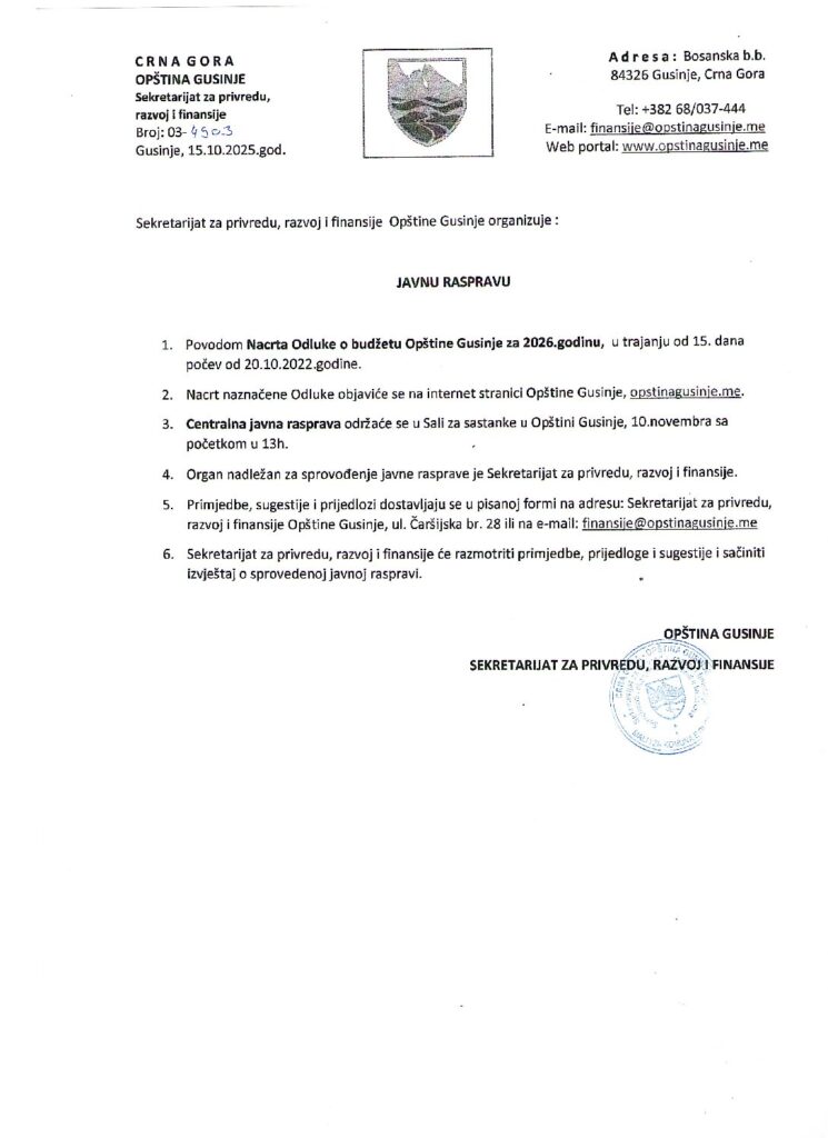 1. Povodom Nacrta Odluke o budžetu Opštine Gusinje za 2026.godinu, u trajanju od 15. dana počev od 20.10.2025.godine.